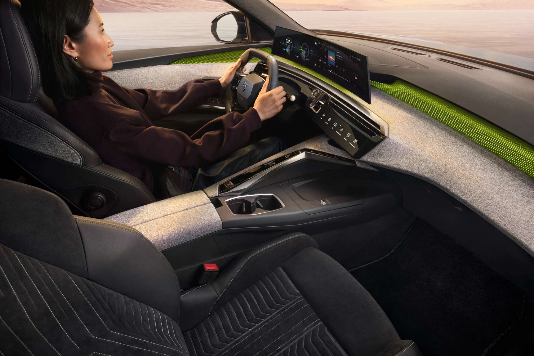 Розташований для досягнення оптимальної ергономіки, новий 21-дюймовий широкоформатний дисплей злегка вигнутий до водія, водночас залишаючись ідеально доступним для пасажира. Таким чином, надзвичайно велика панель для доступу в «цифровий світ автомобіля» органічно поєднує дві ключові складові концепції салону PEUGEOT i-Cockpit®: